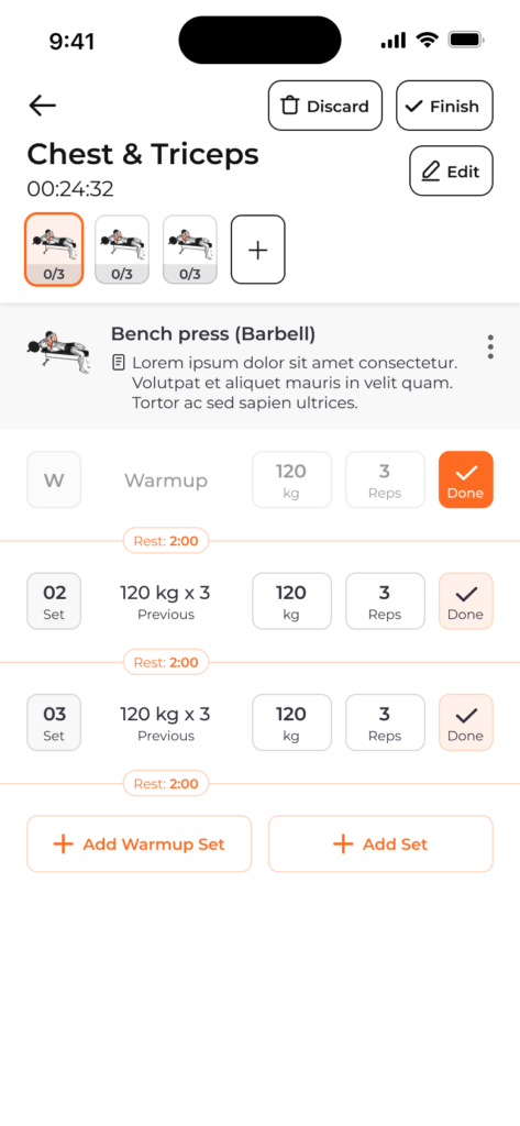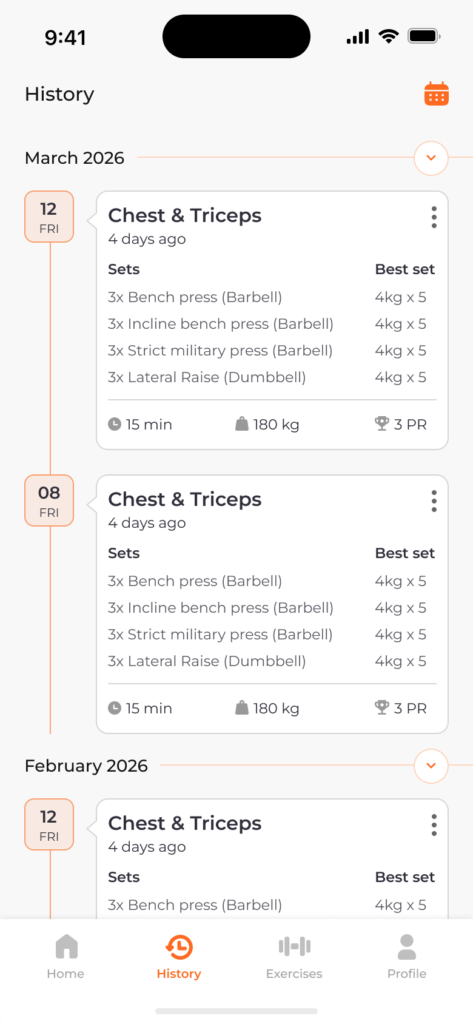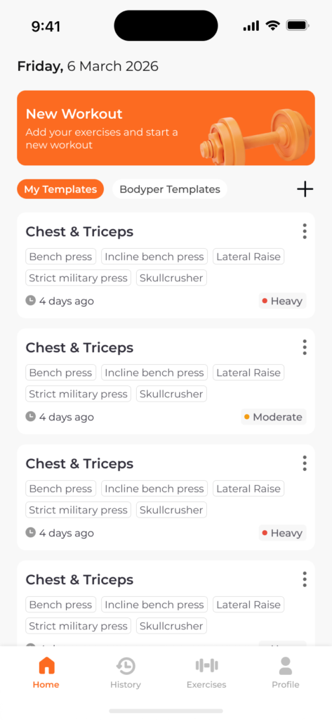 Add exercises, sets, reps and weights in seconds. Bodyper keeps it fast and frictionless so you can focus on lifting.